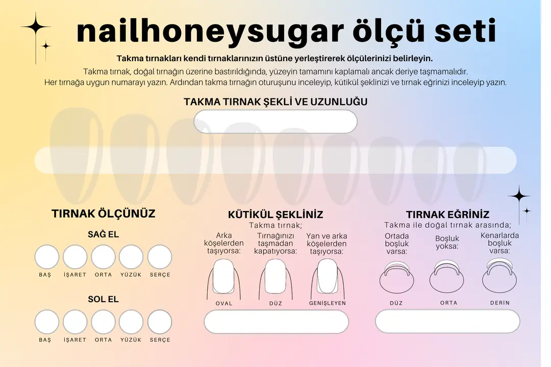 İLK ÖLÇÜ SETİNİZİN TUTARINI SONRAKİ TAKMA TIRNAK SİPARİŞİNİZE İNDİRİM OLARAK YANSITIYORUZ.